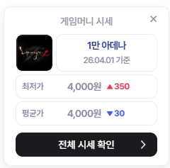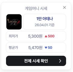 - 어제에 비해 1만 아데나 기준 50원 하락하였습니다